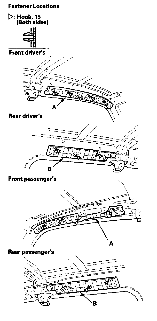 10. Detach the hooks, then remove the front roof side pads (A) and rear roof side pads (B) from both sides.