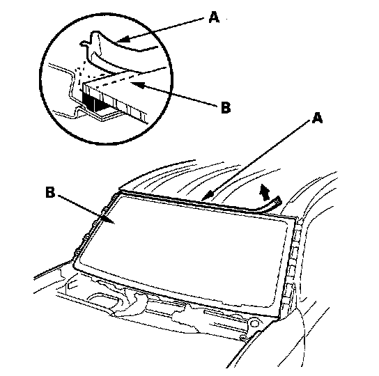 2. Remove the molding (A) from the edge of the windshield (B). If necessary, cut the molding with a utility knife.