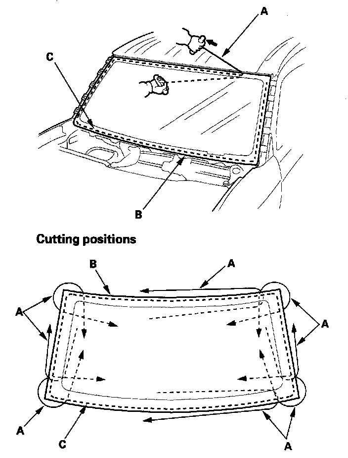 6. With a helper on the outside, pull the piano wire (A) back and forth in a sawing motion. Hold the piano wire as close to the windshield (B) as possible to prevent damage to the body and dashboard. Carefully cut through the rubber dam and adhesive (C) around the entire windshield.