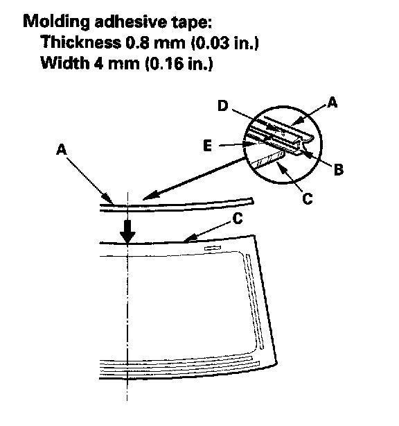 - Be sure the alignment mark (D) of the molding lines up with the alignment mark (E) of the windshield.