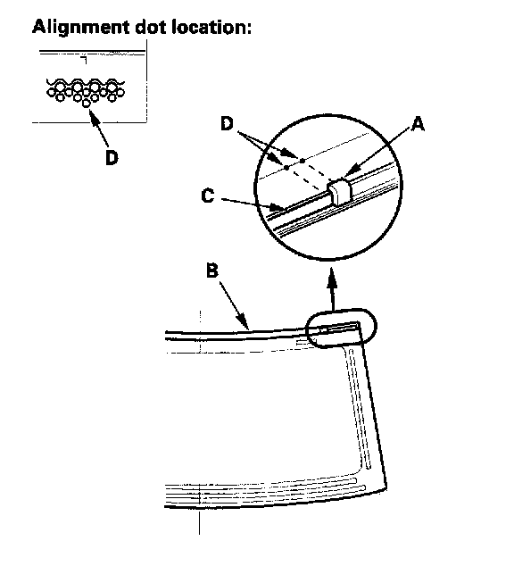 - Be sure the molding upper seal and non-woven fabric line up with the alignment dots (D).