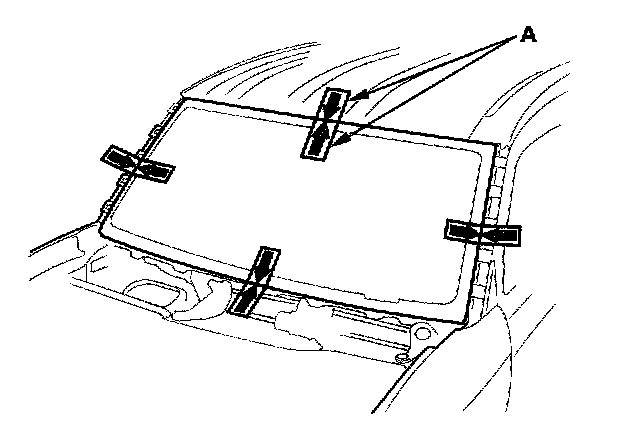 16. Set the windshield in the opening, and center it. Make alignment marks (A) across the windshield and body with a grease pencil at the four points shown. Be careful not to touch the windshield where adhesive will be applied.