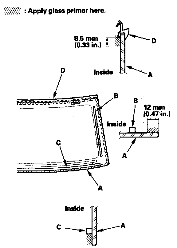 18. With a sponge, apply a light coat of glass primer around the edge of the windshield (A) between the side rubber dam (B), lower rubber dam (C), and molding (D) as shown, then lightly wipe-it off with gauze or cheesecloth: