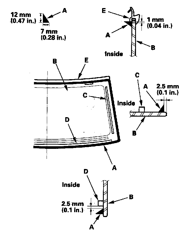 11. Attach the side rubber dam (A), lower rubber dam (B) with adhesive tape. Attach the clips (C) with adhesive tape and dashboard seal (D) to the inside face of the windshield (E) as shown: