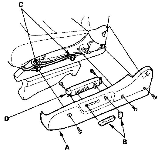 Switch Test/Replacement1. Remove the adjustment switch cover (A) from the driver's seat by removing the three screws, and pulling off the adjustment switch knobs (B).