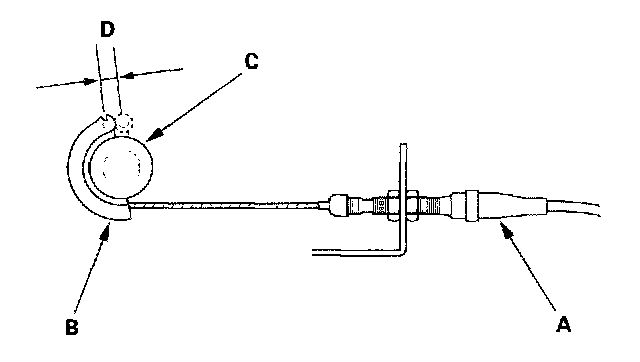 3. Measure the amount of movement of the output linkage (B) until the engine speed starts to increase. At first, the output linkage should be located at the fully closed position (C). The free play (D) should be 3.75 ± 0.5 mm (0.15 ± 0.02 in.).
