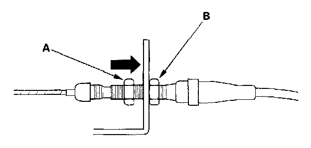 6. Pull the cable so that the adjusting nut (B) touches the bracket, and tighten the locknut (A).