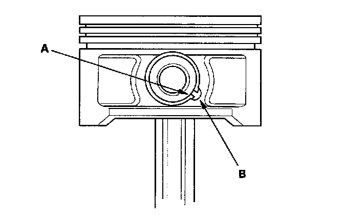 2. Apply engine oil to the piston pin snap rings (A) and turn them in the ring grooves until the end gaps are lined up with the cutouts in the piston pin bores (B).