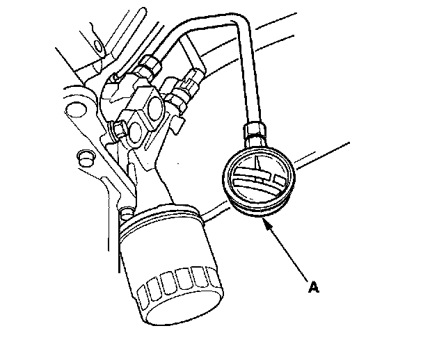 2. Remove the engine oil pressure switch and install an oil pressure gauge (A).