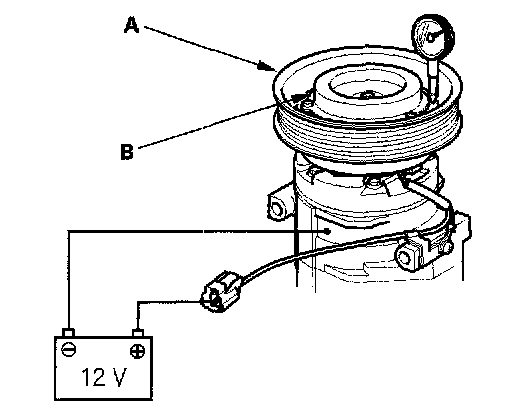3. Measure the clearance between the pulley (A) and the pressure plate (B) with a dial indicator. Zero out the indicator, then apply battery voltage to the compressor clutch. Measure the movement of the pressure plate when the voltage is applied. If the clearance is not within the specified limits, the pressure plate must be re-shimed.