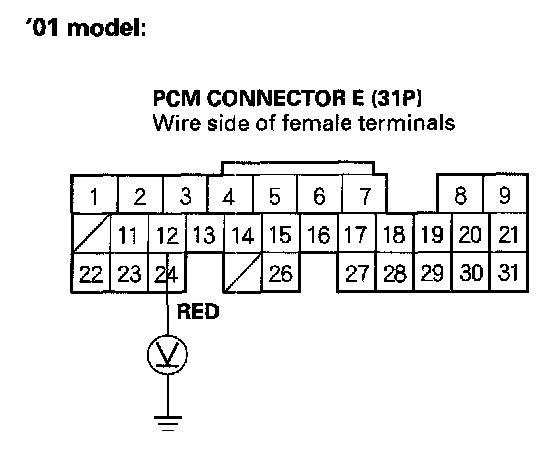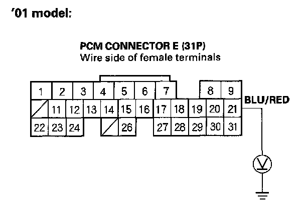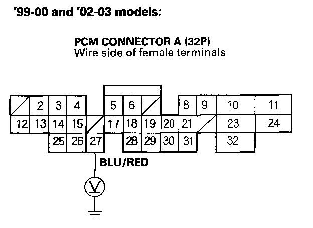 14. '99-00 and'02-03 models Using the Backprobe Set, measure the voltage between the No.27 terminal of PCM connector A (32P) and body ground with the PCM connectors connected. '01 model. Using the Backprobe Set, measure the voltage between the No.21 terminal of PCM connector E (31P) and body ground with the PCM connector connected.