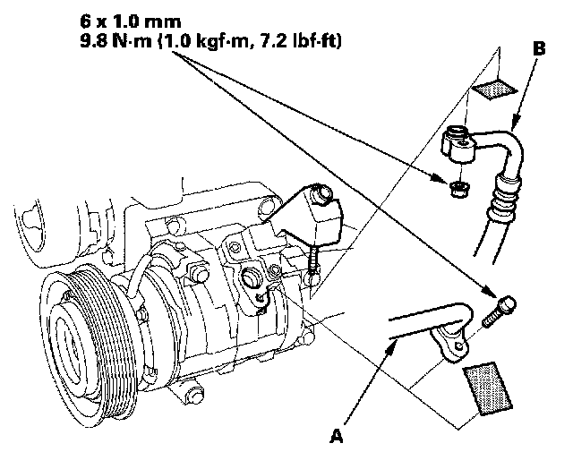 7. Remove the bolt and the nuts, then disconnect the suction line (A) and discharge line (B) from the compressor. Plug or cap the lines immediately after disconnecting them to avoid moisture and dust contamination.