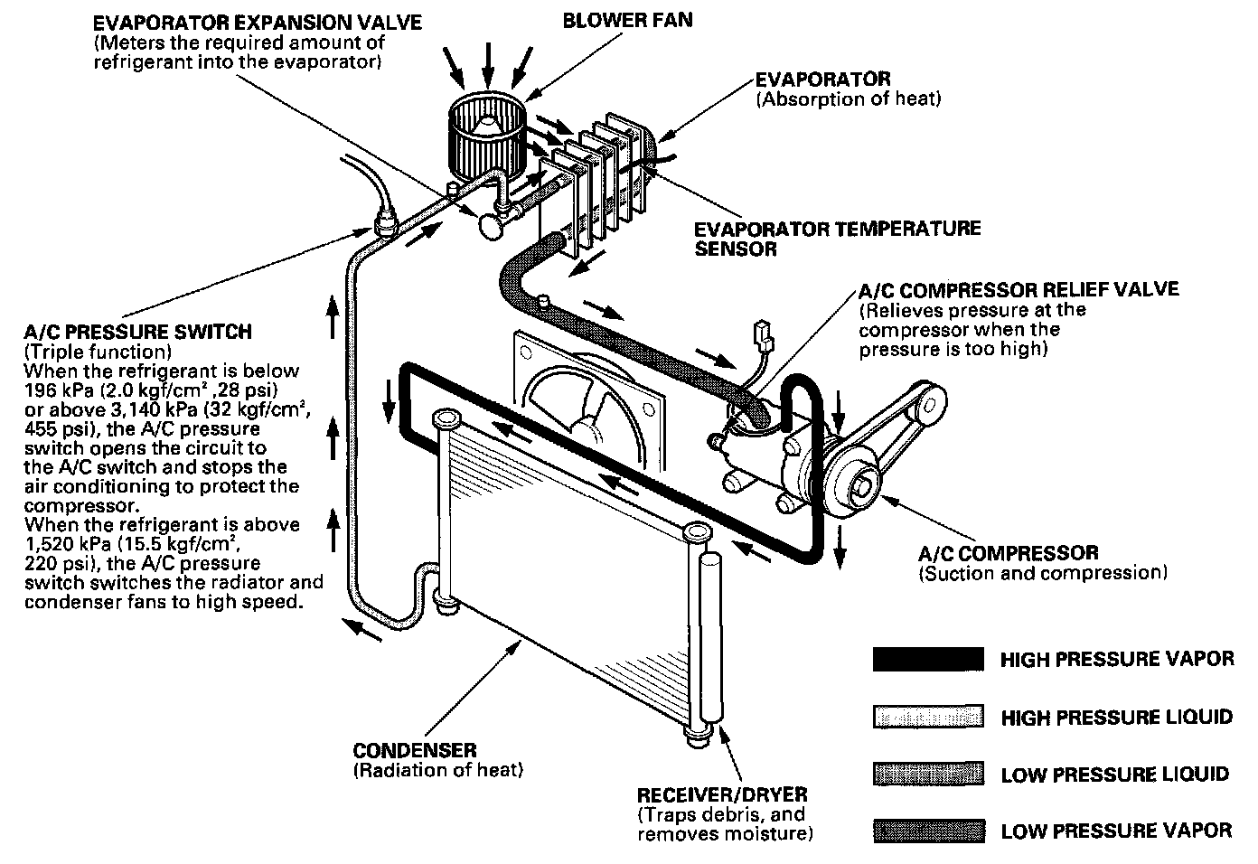 System DescriptionThe air conditioning system removes heat from the passenger compartment by circulating refrigerant through the system as shown.