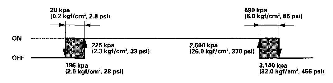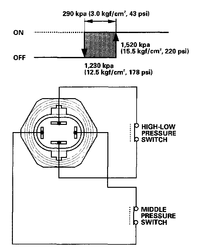 If the refrigerant pressure goes above or below 1,520 kPa (15.5 kgf/sq.cm, 220 psi), the A/C pressure switch sends a signal to the heater control panel or the climate control unit to change the speed of the condenser fan and radiator fan (High-Low).