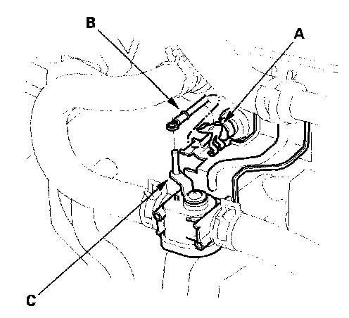 Heater Valve Cable Adjustment1. From underthe hood, open the cable clamp (A), then disconnect the heater valve cable (B) from the heater valve arm (C).