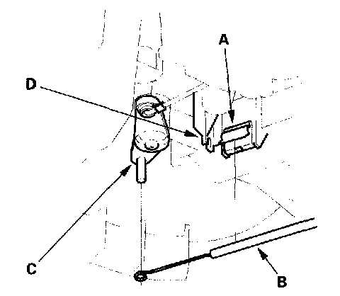 4. Attach the heater valve cable (B) to the air mix control linkage (C) as shown above. Hold the end of the heater valve cable housing against the stop (D), then snap the heater valve cable housing into the cable clamp (A).