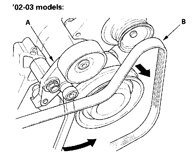 2. Move the auto-tensioner (A) to relive tension from the alternator-compressor belt (B), and remove the belt.