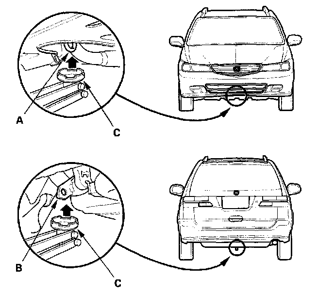 3. Position the floor jack under the front jacking bracket (A) or rear jacking bracket (B), center the jack lift platform (C), on the jacking bracket and jack up the vehicle high enough to fit the safety stands under it.
