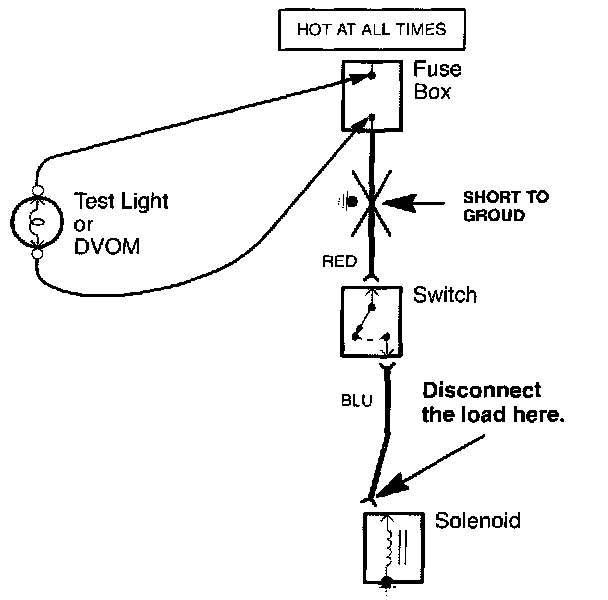 4. Where the test light goes off, or the DVOM voltage drops to zero, there is a short to ground in the wiring near that point.