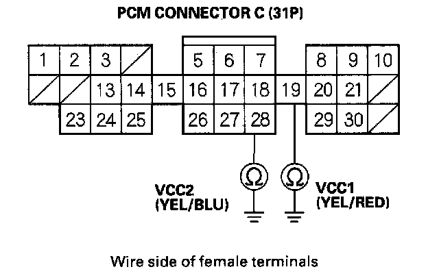 17. Disconnect the 3P connector from each of these sensors, one at a time, and check for continuity between body ground and PCM connector terminal C19 and C28 individually.