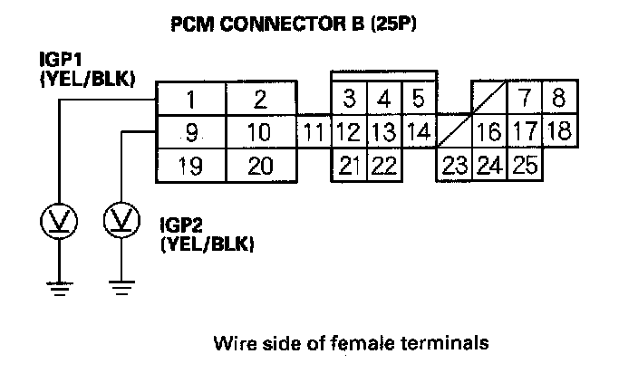 25. Turn the ignition switch ON (II), and measure voltage between body ground and PCM connector terminals B2, 810, B20 and 822 individually.