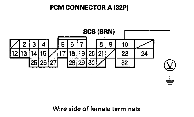 26. Turn the ignition switch OFF, then turn it back ON (11) and measure voltage between PCM connector terminal A10 and body ground.