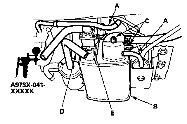 6. Disconnect the vacuum hose (A) from the EVAP control canister (B), and then plug the ports with plugs (C).