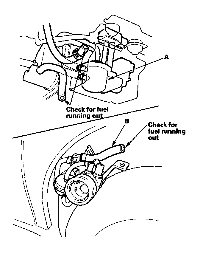 11. Fill the fuel tank with fuel, then check for fuel in the EVAP two way valve (A) and fuel tank vapor recirculation hose (B).