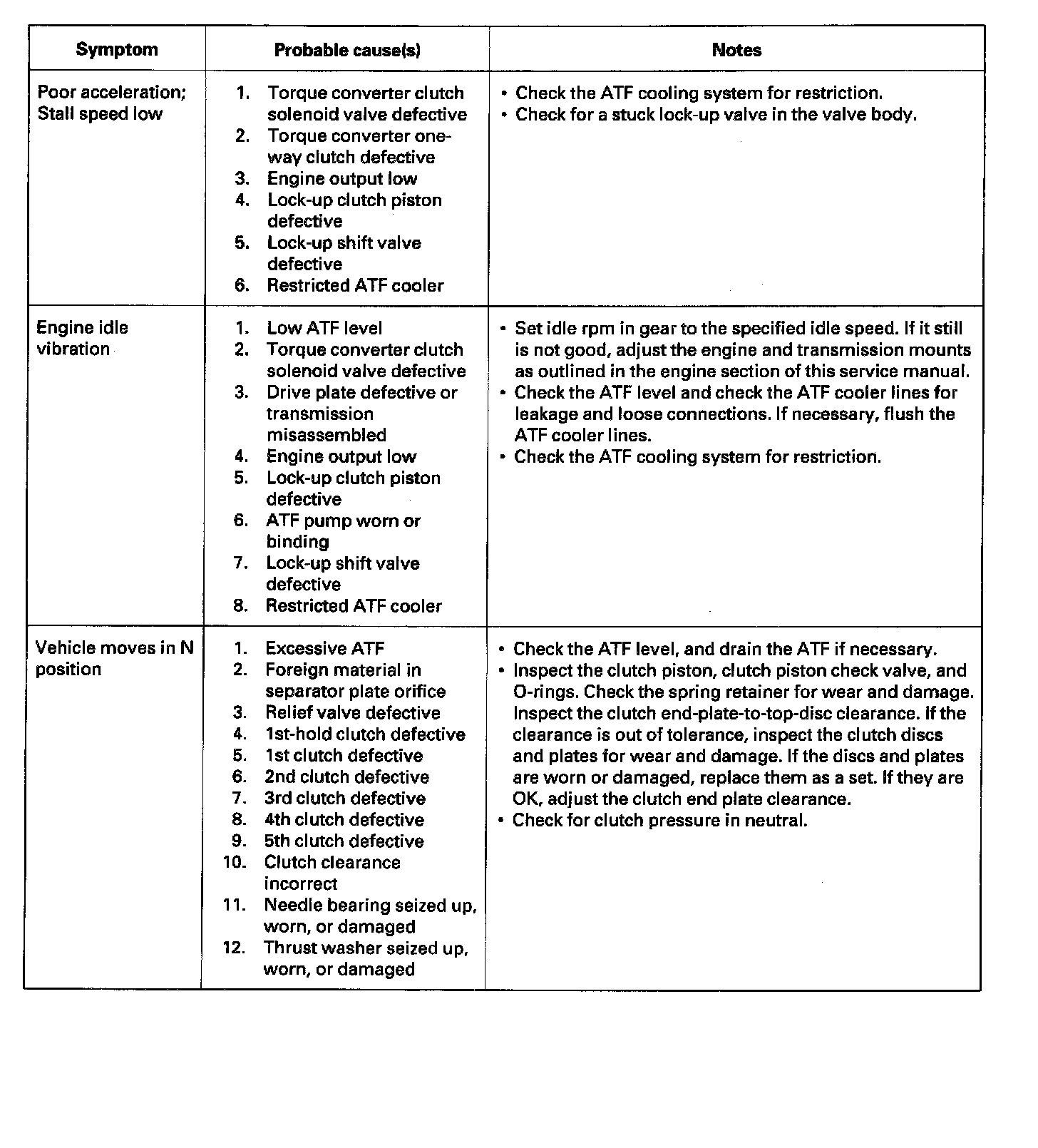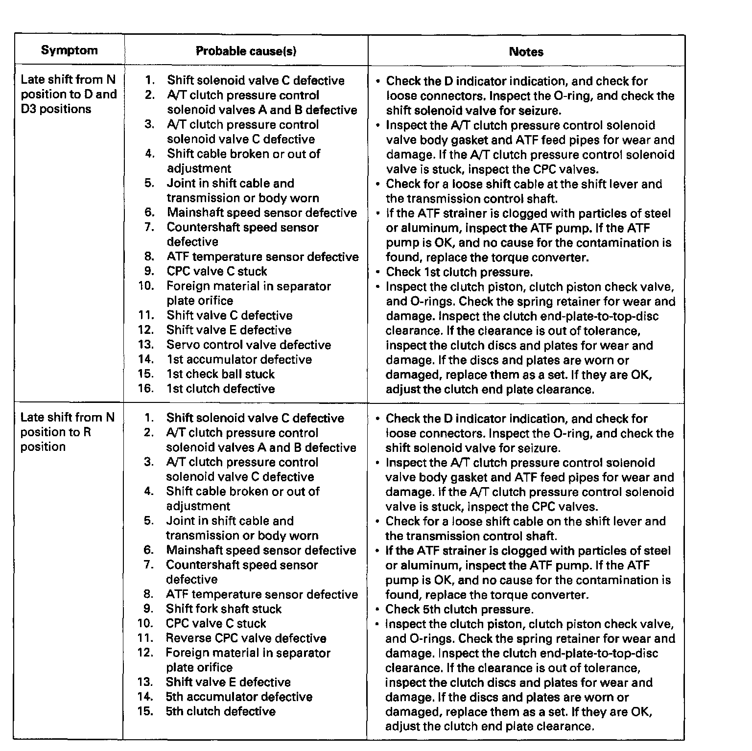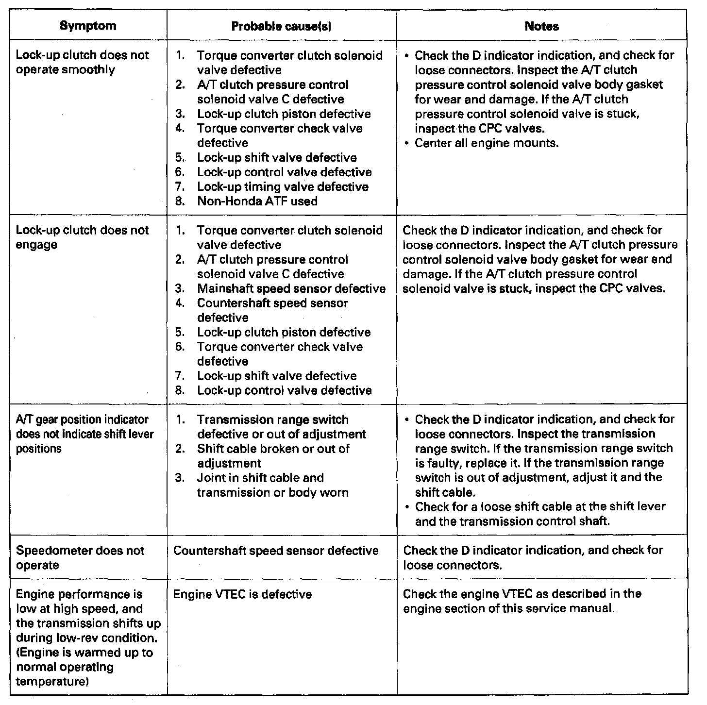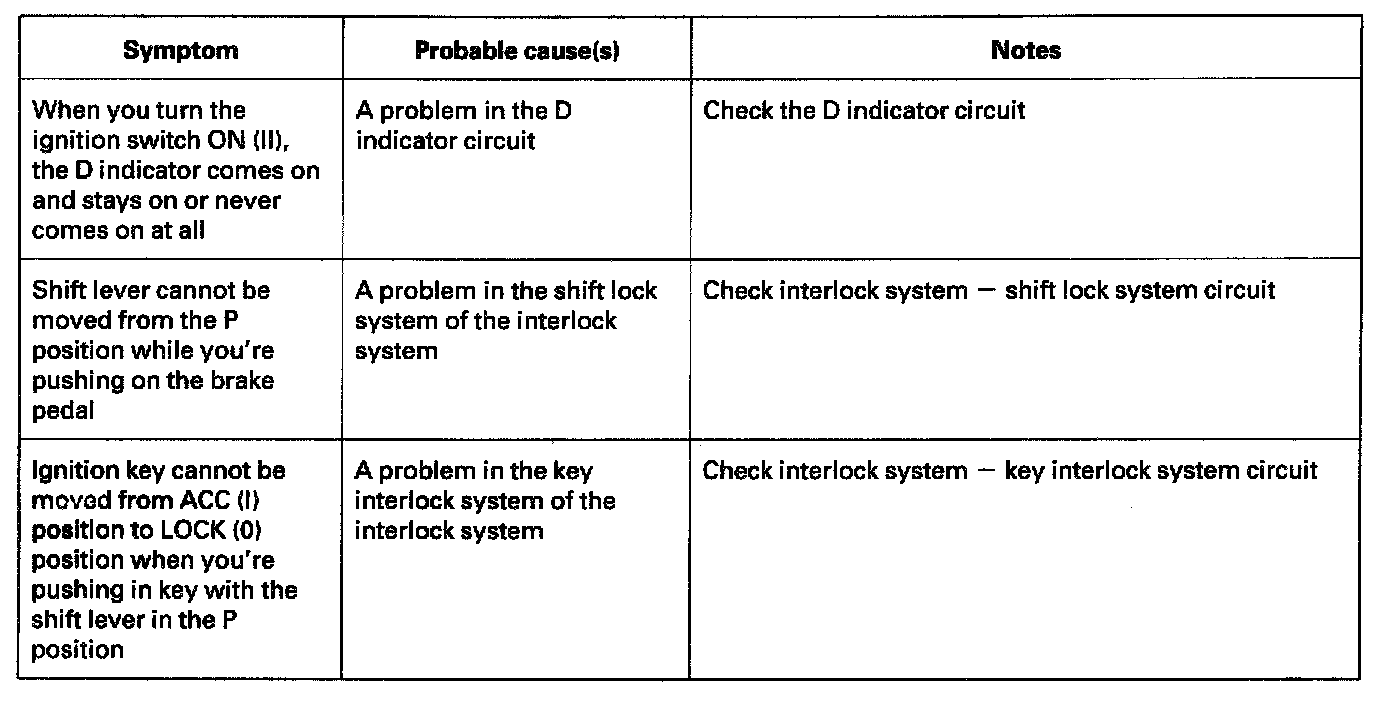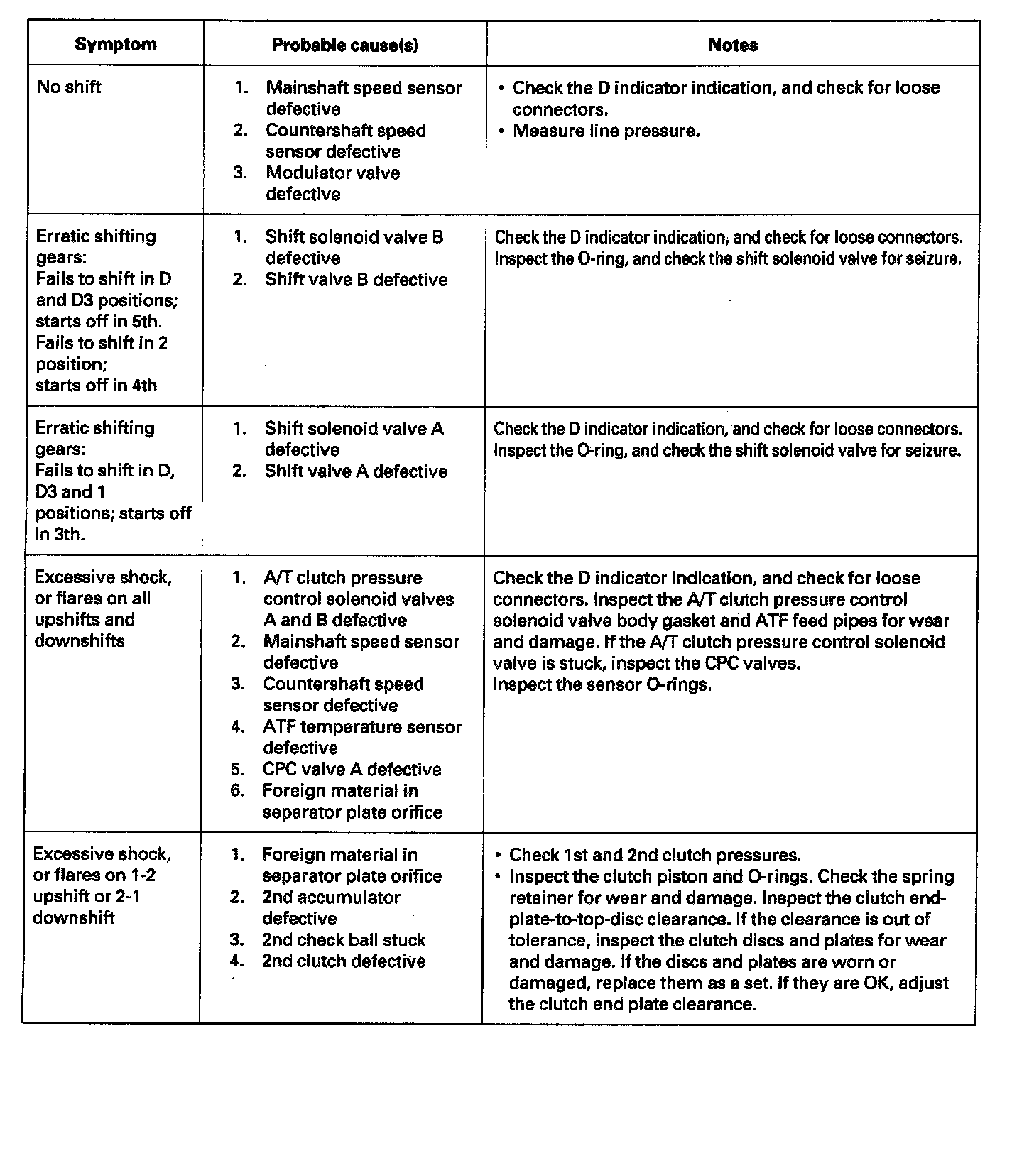 Symptom Troubleshooting IndexThese symptoms DO NOT trigger Diagnostic Trouble Codes (DTCs) or cause the D indicator to blink. If the MIL was reported ON or the D indicator has been blinking, check for DTCs. But if the vehicle has one of the symptoms in the chart, check the probable cause(s) for it, in the sequence listed, until you find the problem.