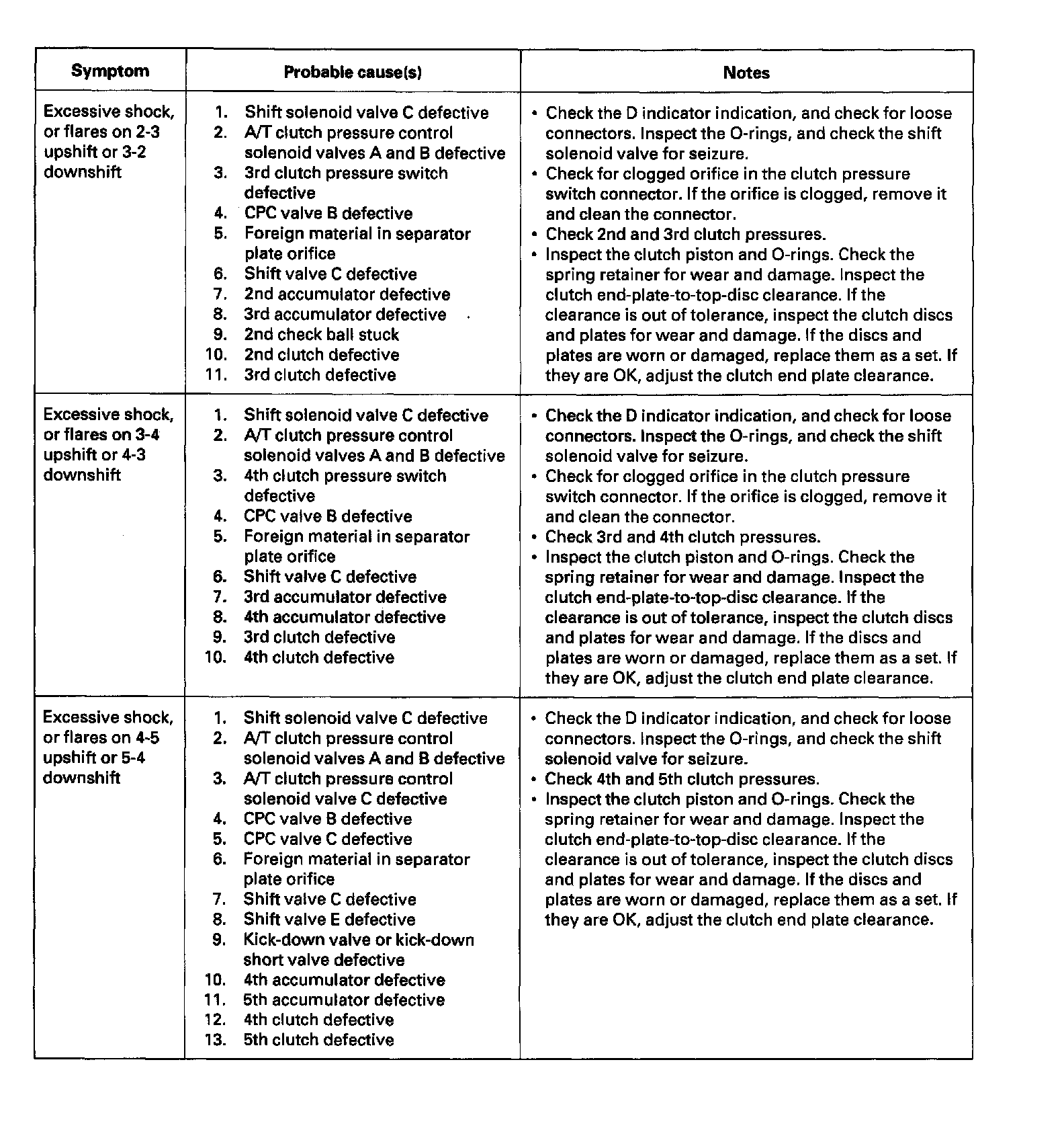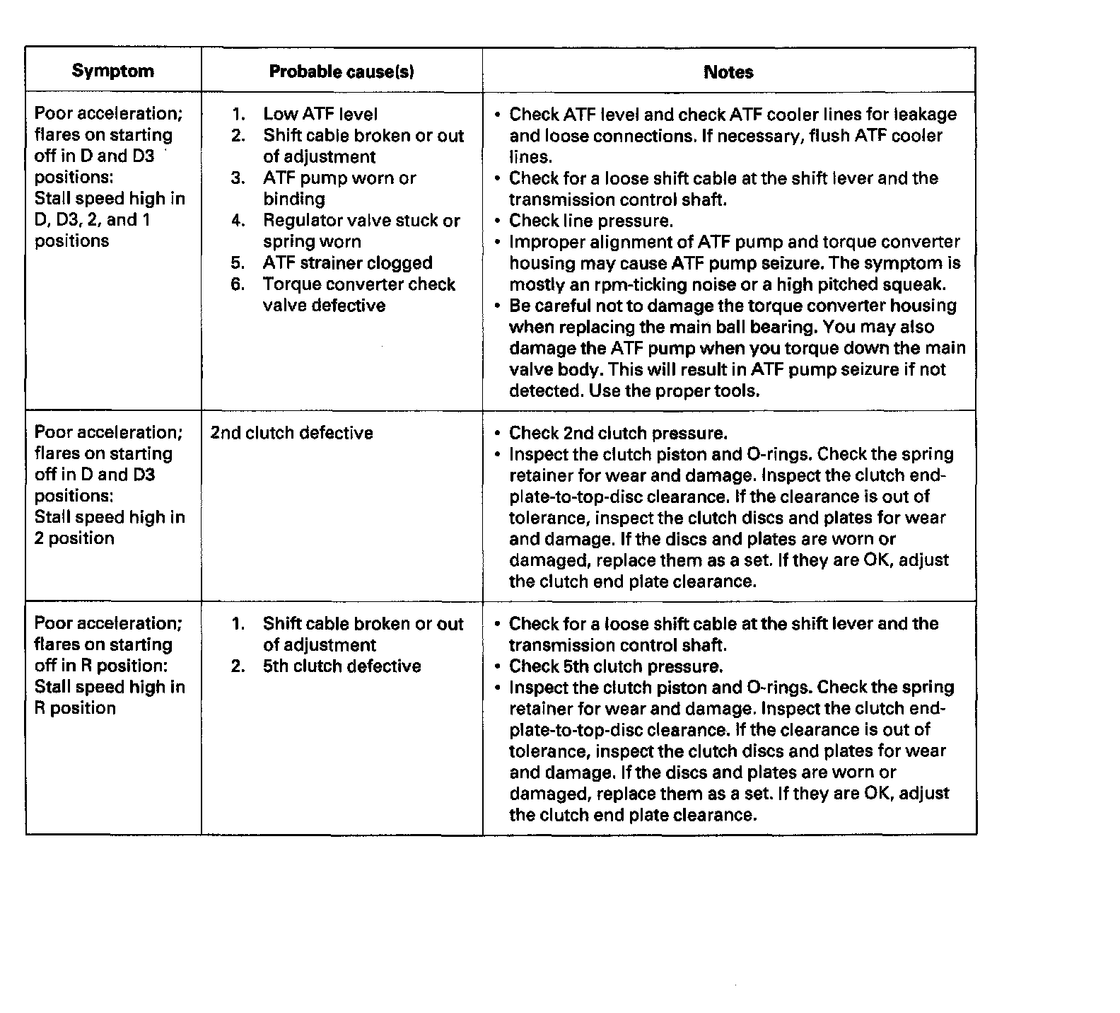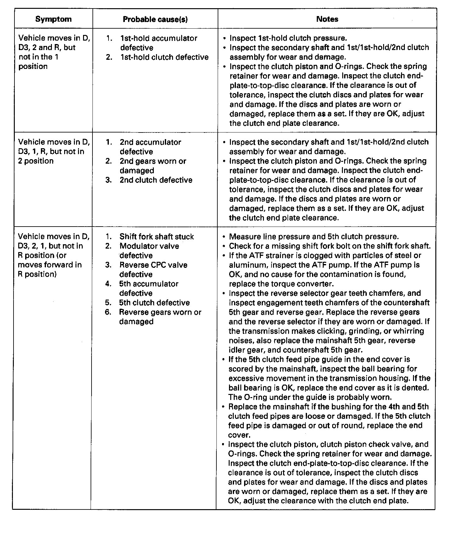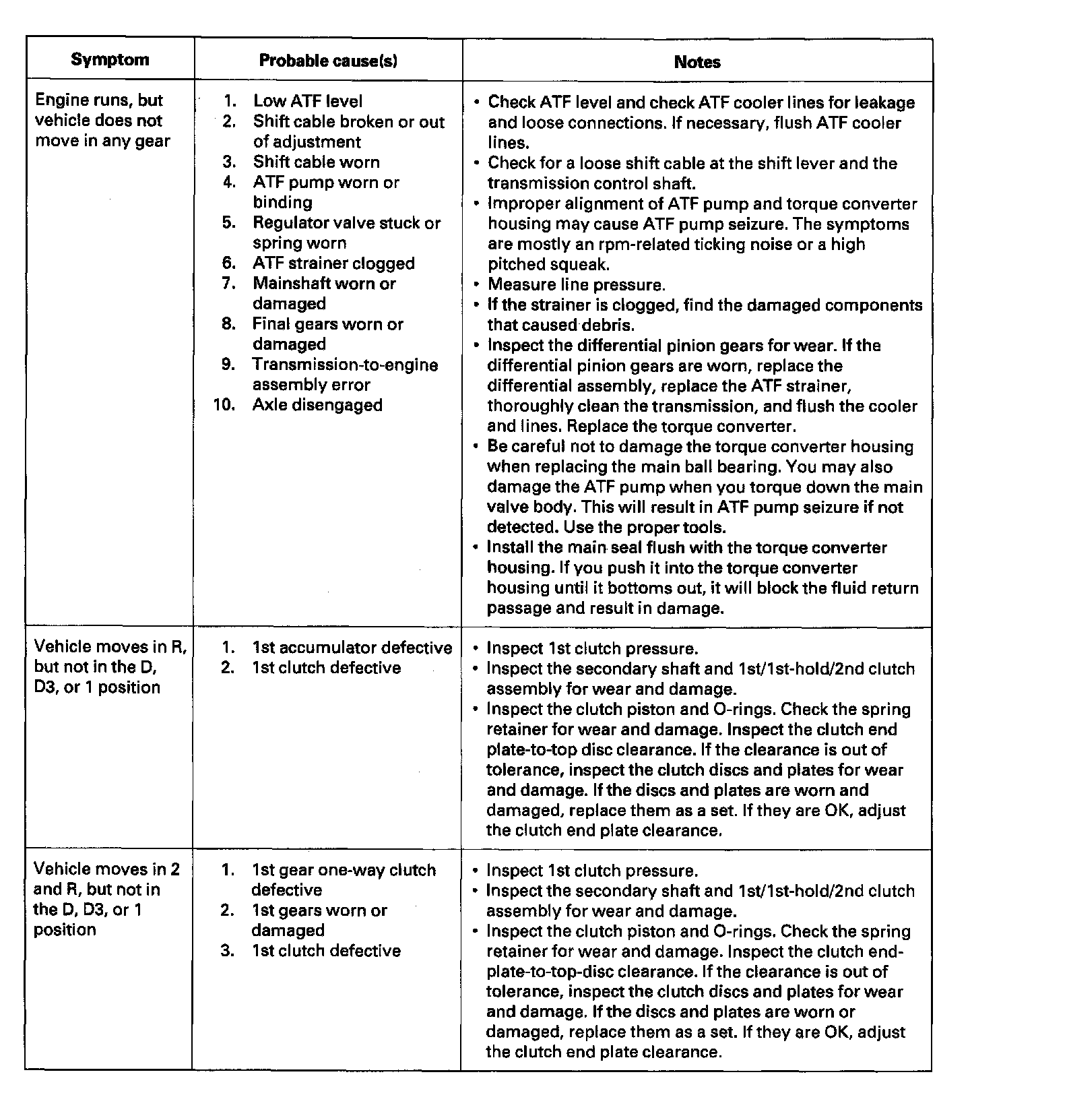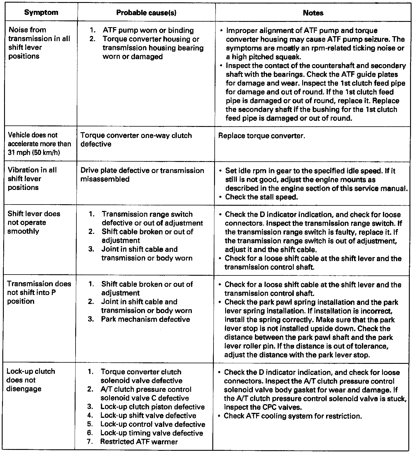 Symptom Troubleshooting IndexThese symptoms DO NOT trigger Diagnostic Trouble Codes (DTCs) or cause the D indicator to blink. If the MIL was reported ON or the D indicator has been blinking, check for DTCs. But if the vehicle has one of the symptoms in the chart, check the probable cause(s) for it, in the sequence listed, until you find the problem.