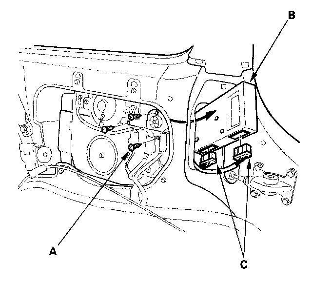 3. Remove the three mounting screws (A) from the power sliding door control unit (B).