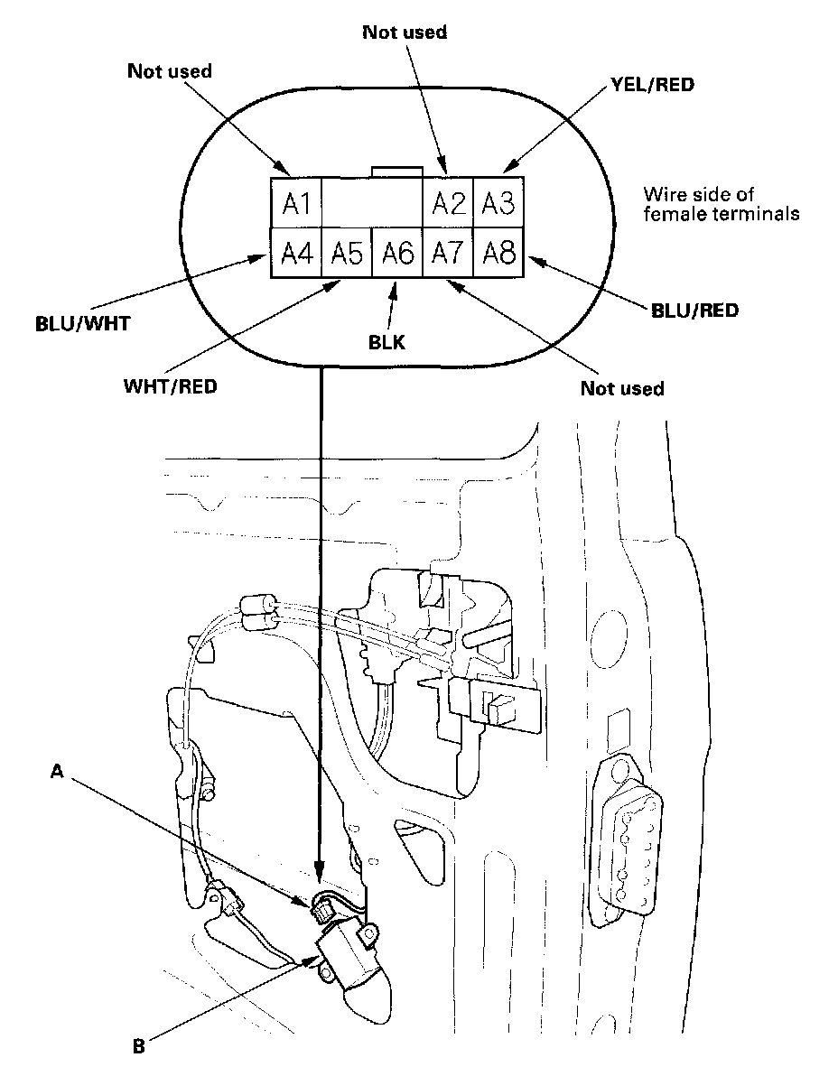 2. Disconnect the 8P connector (A) from the sliding door control unit (B).