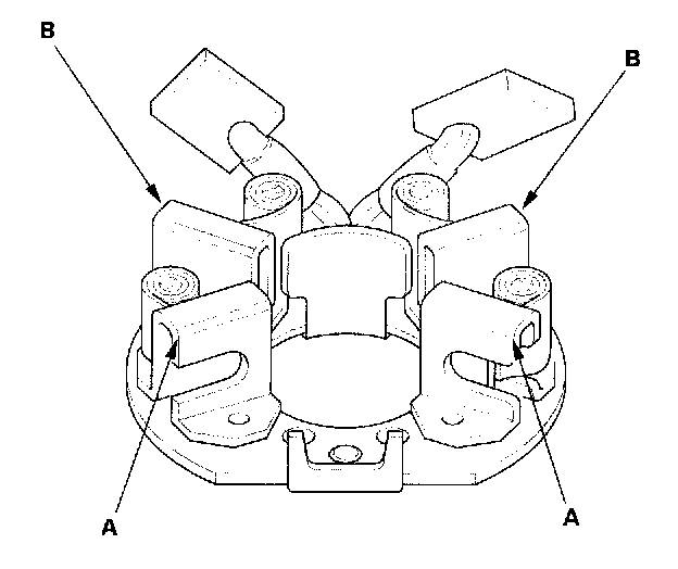 12. Check that there is no continuity between the (+) brush holder (A) and (-) brush holder (B). If there is continuity, replace the brush holder assembly.