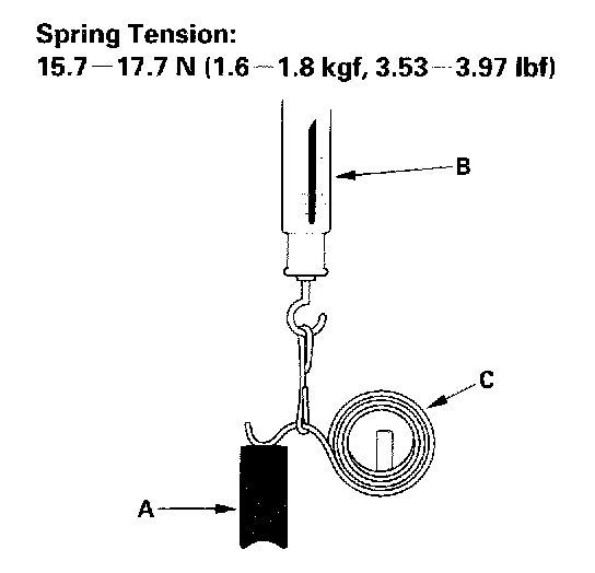 13. Insert the brush (A) into the brush holder, and bring the brush into contact with the commutator, then attach a spring scale (B) to the spring (C). Measure the spring tension at the moment the spring lifts off the brush.