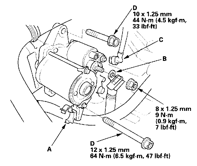 4. Remove the two bolts (D) holding the starter, then remove the starter.