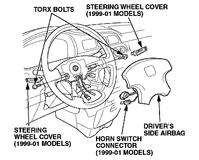 5. 1999-01 models: Remove the two steering wheel covers. Use a Torx T30 bit to remove the two Torx bolts. Lift up the driver's airbag, disconnect the horn switch 1P connector, and remove the driver's airbag.