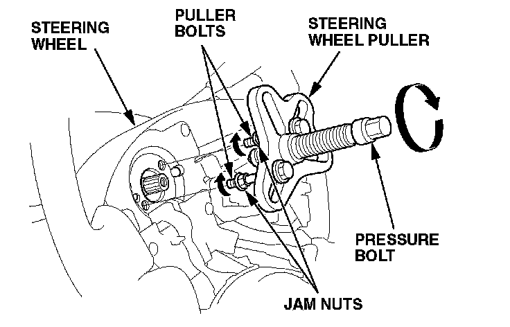 9. Using a commercially available steering wheel puller, release the steering wheel from the steering shaft. While pulling on the steering wheel, note these items: