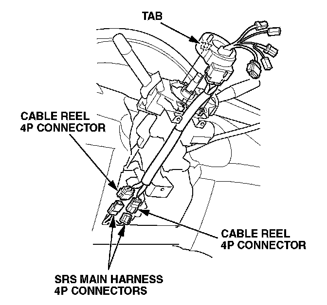 2001-02 models: Unplug the SRS main harness 4P connectors from the cable reel 4P connectors. Release the tab, and then remove the cable reel from the column