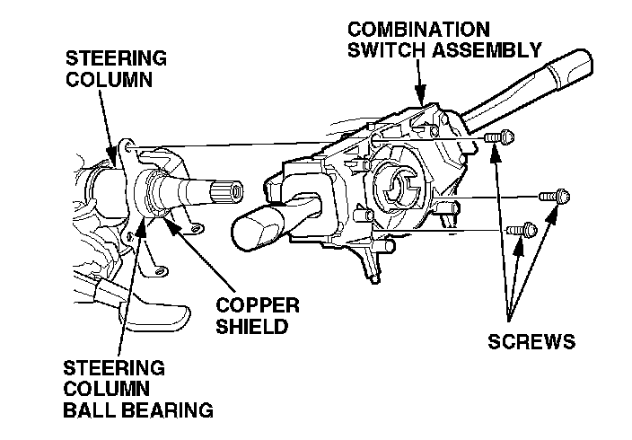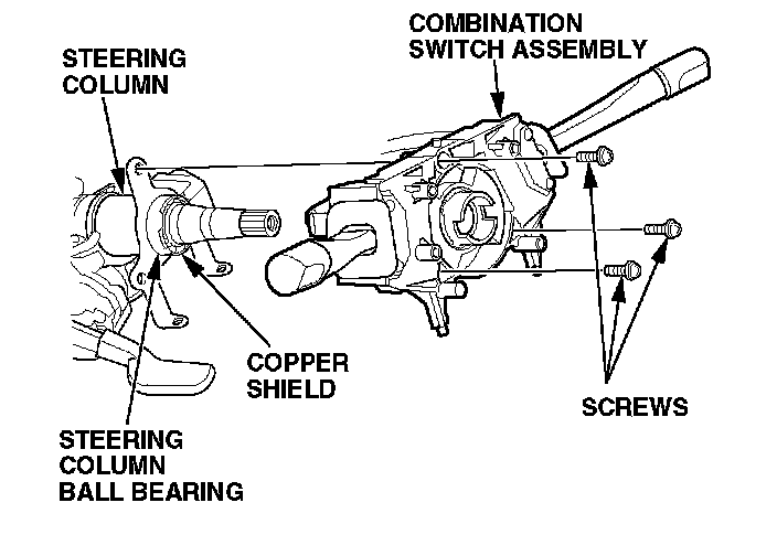 12. Unplug the combination switch 14P connector and both wiper/washer 8P connectors. Remove the three screws from the combination switch assembly, and then remove the combination switch from the steering column.