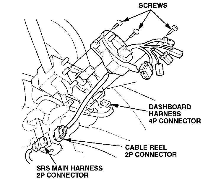 2P connector from the cable reel 2P connector, and then detach the dashboard wire harness 4P connector from the cable reel. Remove the screws from the cable reel, and then remove the cable reel from the column.