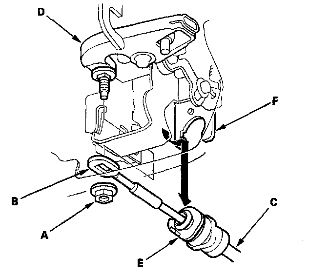 6. Rotate the socket holder (E) on the shift cable counterclockwise a quarter turn, then slide the holder to remove the shift cable from the shift cable bracket (F).