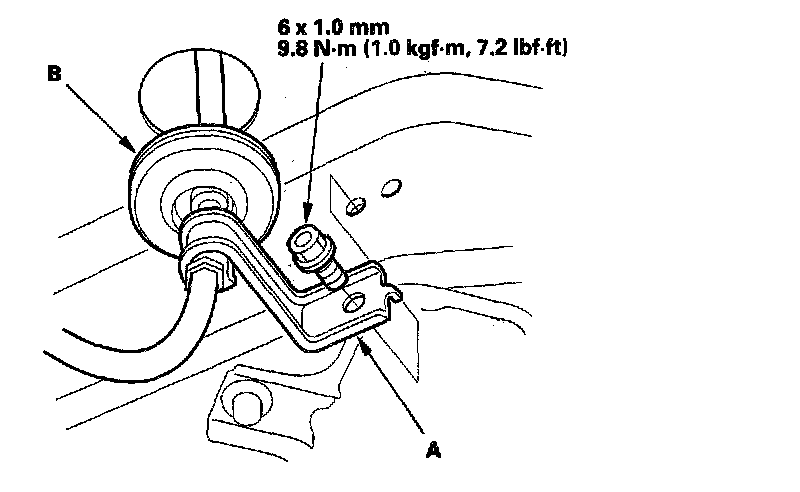 7. Remove the shift cable guide bracket (A) and grommet (B).