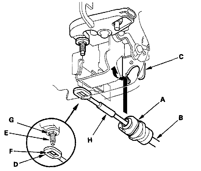 19. Align the socket holder (A) on the shift cable (B) with the slot in the shift cable bracket (C), then slide the holder into the bracket. Install the shift cable end (D) over the mounting stud (E) by aligning its square hole (F) with the square fitting (G) at the bottom of the stud, and rotate the holder clockwise a quarter turn to secure the shift cable.