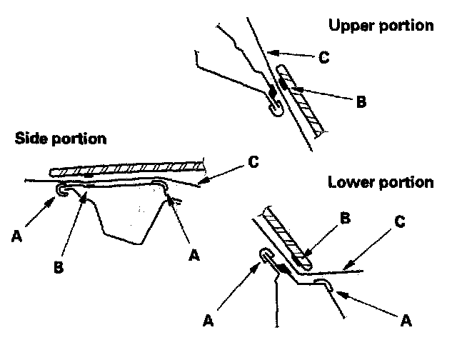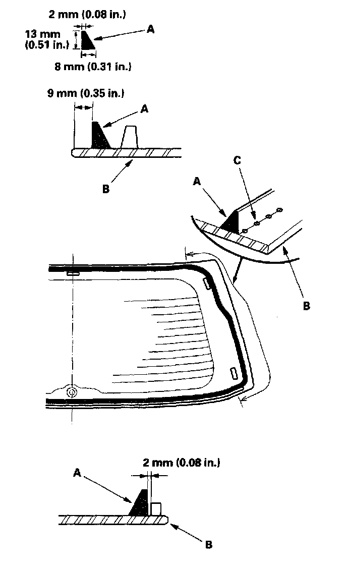 17. Pack adhesive into the cartridge without air pockets to ensure continuous delivery. Put the cartridge in a caulking gun, and run a bead of adhesive (A) around the edge of the rear window (B) as shown. With the printed dots (C) on the rear window as a guide, apply the adhesive to both side portions of the rear window.