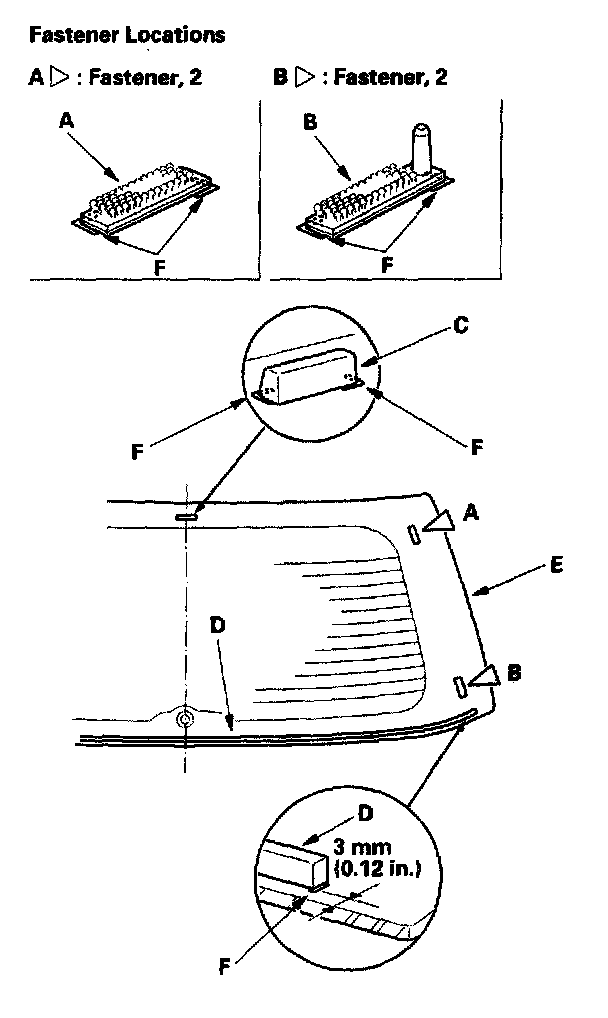 10. Attach the upper corner fasteners (A) and lower corner fasteners (B) with adhesive tape (3M 5312, or equivalent). Attach the upper spacer (C) and lower rubber dam (D) with adhesive tape (NITTO 501M, or equivalent) to the inside surface of the rear window (E) as shown: