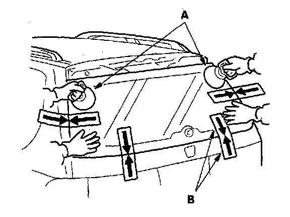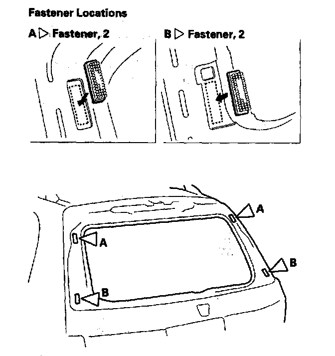 11. Attach the upper corner fasteners (A) and lower corner fasteners (B) with adhesive tape (3M5312, or equivalent) to the tailgate as shown.