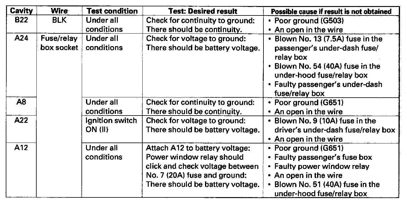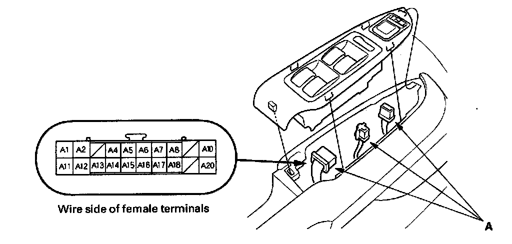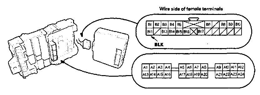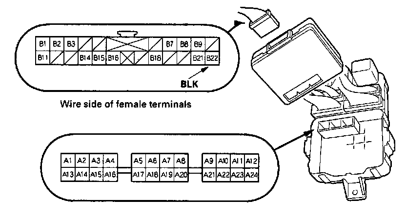 10. Make the given input tests at 22P connector B and the driver's under-dash fuse/relay box socket connector A. Be careful not to spread the fuse box connectors.