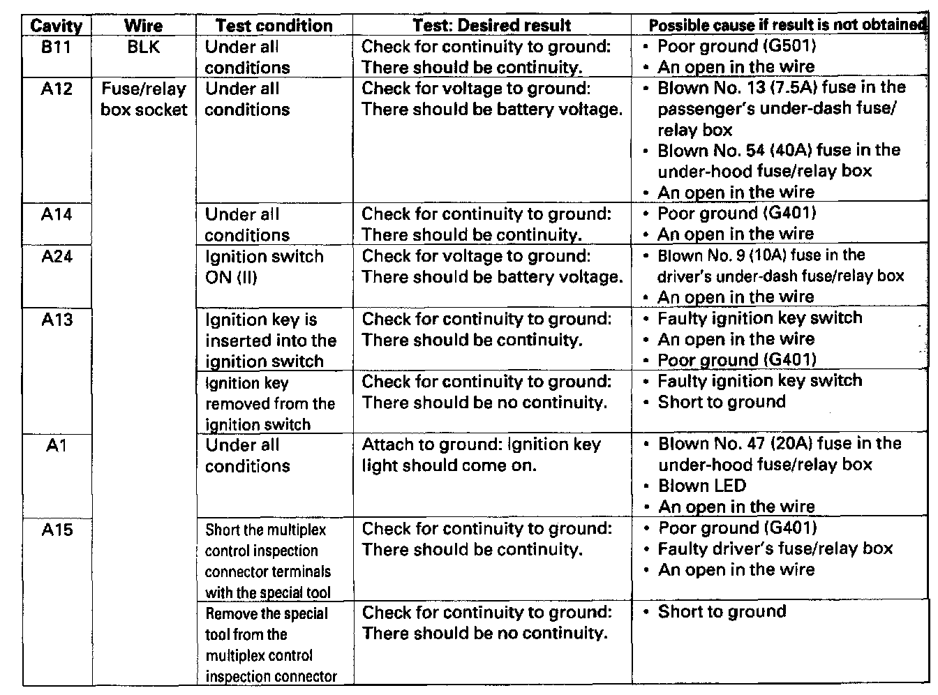 Multiplex Control Unit Input TestBefore performing the multiplex control unit input test, do the multiplex troubleshooting (Mode 1 and Mode 2).