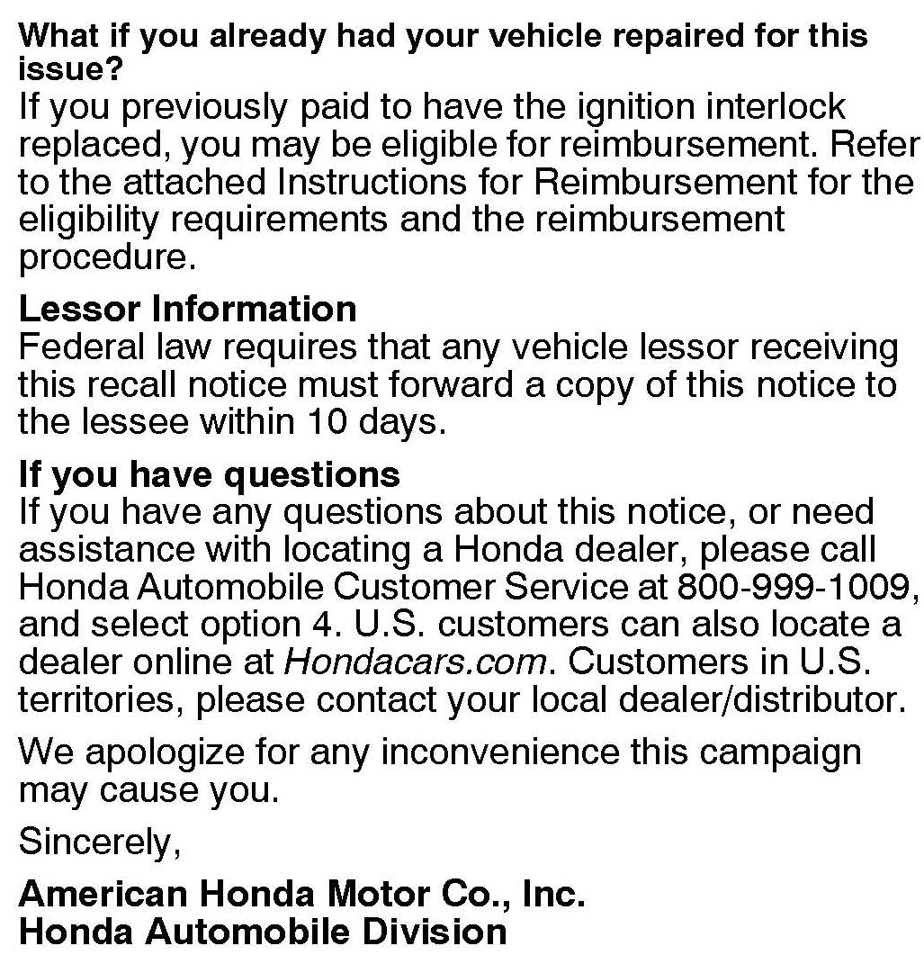 Should your dealership sell an unrepaired vehicle that subsequently causes injury or damage because of the recalled item, the dealership will be solely responsible to the damaged party, and will be required to defend and indemnify American Honda for any resulting claims. To see if a vehicle in inventory is affected by this recall, do a VIN status inquiry before selling it.
