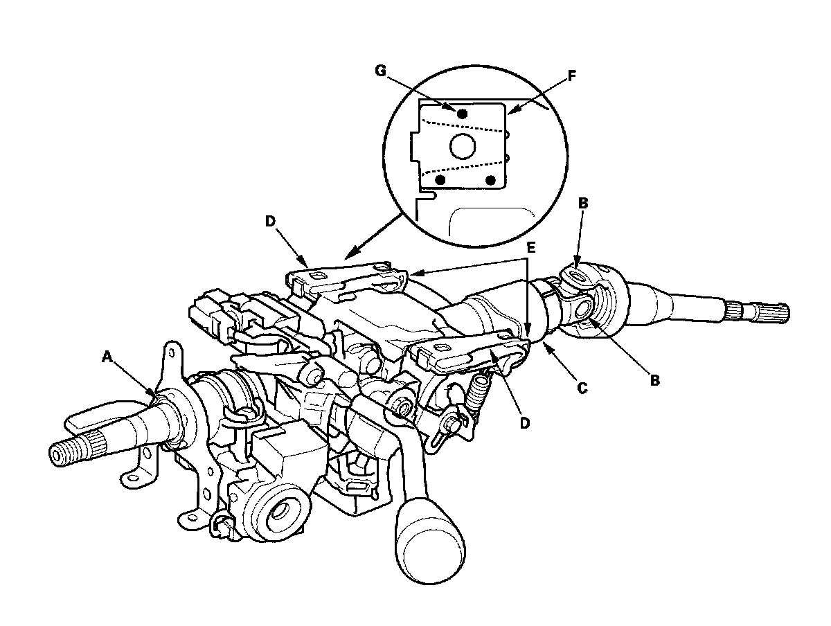 - Check the absorbing plates (D), absorbing plate guides (E) and sliding capsules (F) for distortion or breakage. If there is distortion or breakage, replace the steering column as an assembly. The sliding capsule is attached to the column bracket with the plastic injections (G).